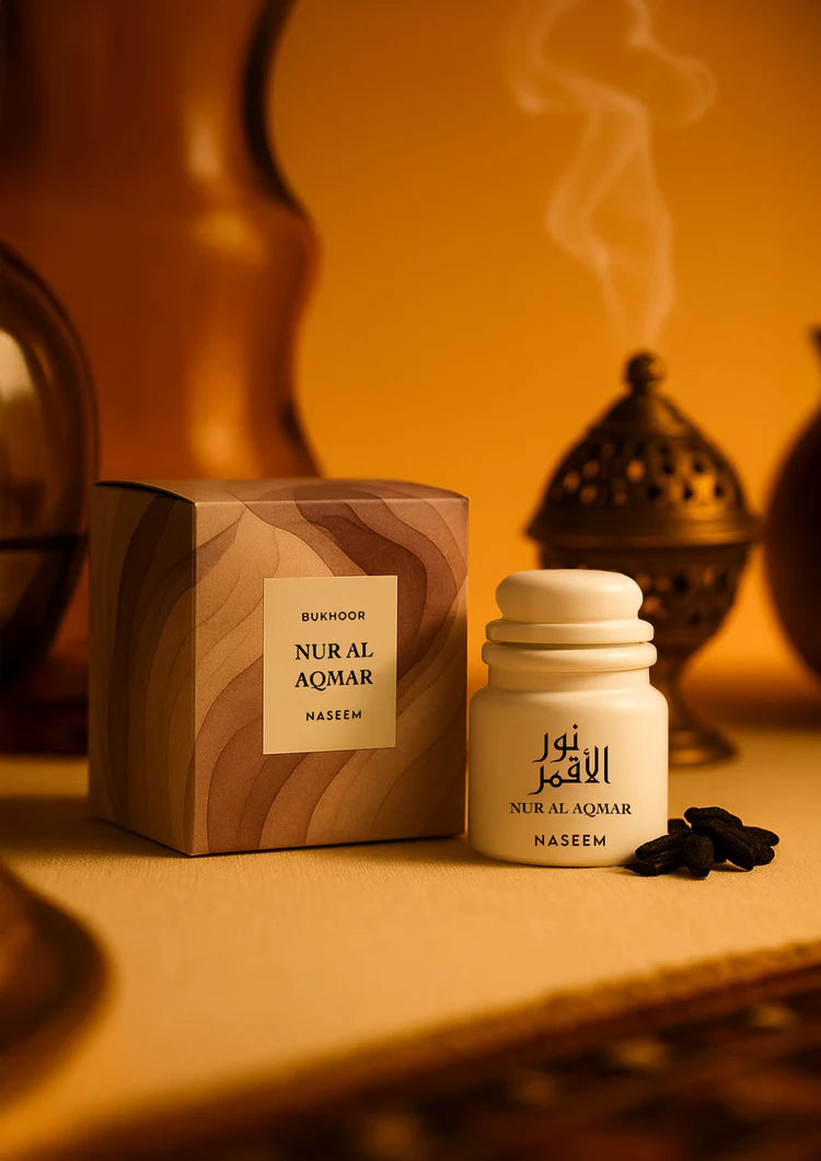 NUR AL AQMAR is a sophisticated aromatic woody bakhoor that radiates warmth, elegance, and mystique. The scent opens with a refined blend of teakwood, saffron, and tagetes, delivering a subtly spicy and woody introduction.