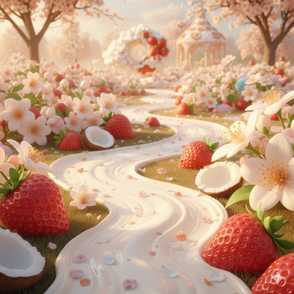 As the day warmed, the garden turned into a carnival of soft delights. A cloud of marshmallow sweetness floated in, light as a secret, wrapping around her like a shy smile. Strawberry appeared next—ripe, rosy, and a little mischievous—followed by a creamy swirl of coconut that made everything feel smooth and dreamy. Somewhere in the breeze, orange blossom opened its petals, adding a gentle floral glow, like a necklace of white flowers resting on warm skin